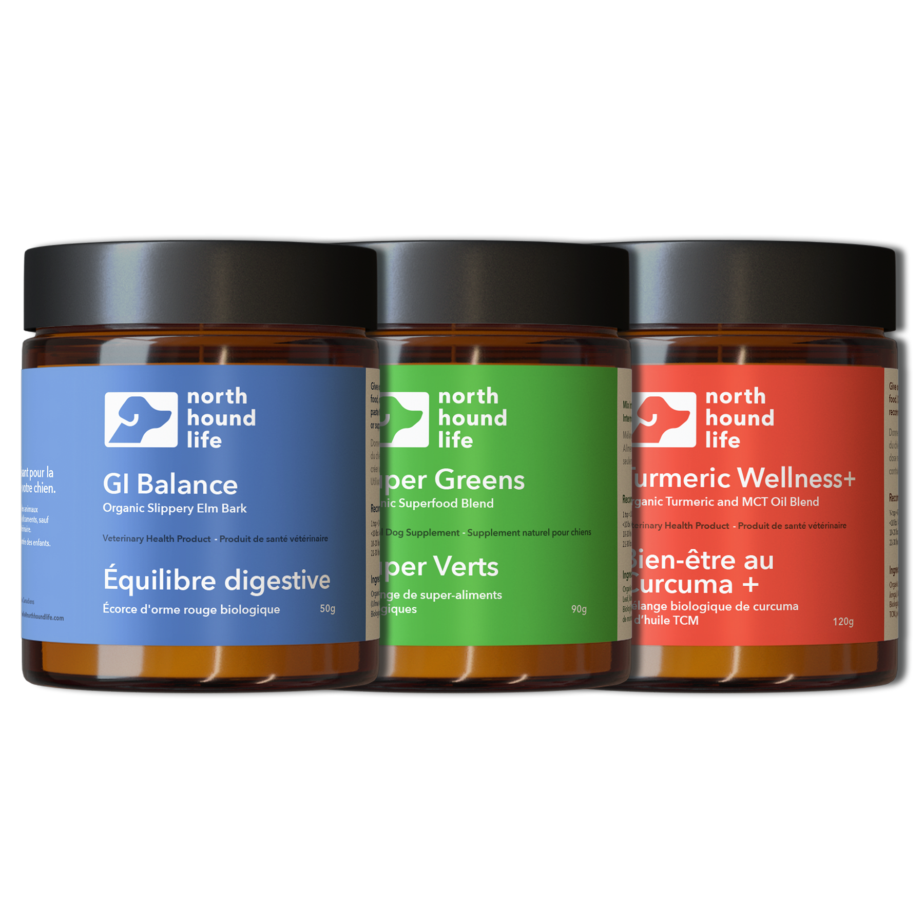 Support your dog's health with our Super Dogs Bundle from north hound life. This carefully curated trio combines the power of Super Greens | Superfood Blend, GI Balance | Slippery Elm Bark, and Turmeric Wellness+ | Turmeric and MCT Oil blend to provide overall support for your furry friend.